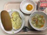 <献立>・あしたばパン・チキンポテトグラタン・野菜スープ・もも缶・牛乳 今日のパ...