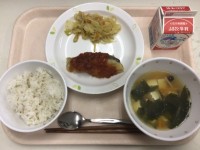 <献立>・麦ごはん・魚のチリソース・春雨中華炒め・豆腐とわかめのスープ・牛乳 魚...