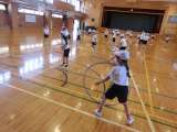 1年の体育です。 ペアになりフラフープを使い、体を動かします。 始めに、2人とも...