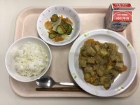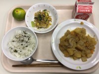 <献立>・ごはん・さつまいものそぼろ煮・野菜のピリカラ・牛乳 さつまいもは「根菜...