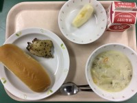 <献立>・ミルクパン・鶏肉のバジル風味・クラムチャウダー・りんご 今日の鶏肉のバ...