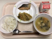 <献立>・麦ごはん・魚の香味焼き・切干大根のオイスター炒め・五目野菜スープ・牛乳...