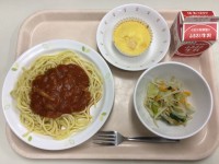 <献立>・チキンとトマトのスパゲティ・こまつなサラダ・ももの米粉ケーキ・牛乳 今...