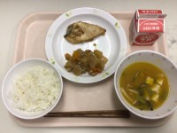 <献立>・ごはん・魚の七味焼き・鶏肉とだいこんの煮物・かぼちゃのみそ汁・牛乳 今...