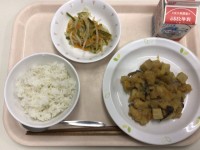 <献立>・麦ごはん・鶏肉とじゃがいもの揚げ煮・茎わかめの甘酢あえ・牛乳 鶏肉とじ...