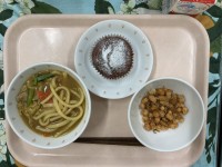 カレーうどん牛乳大豆とじゃこの甘辛あげチョコチップ入り米粉の豆乳ケーキ今日は6年...