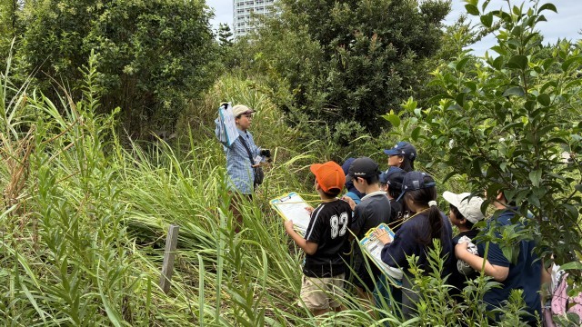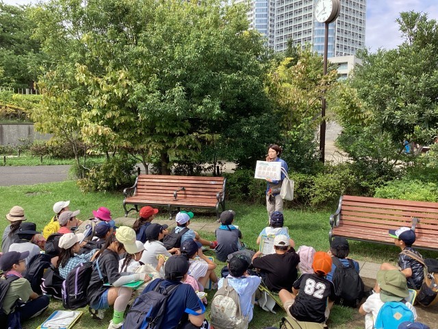 二子玉川公園には、生き物が棲みやすいように「サンクチュアリ」と呼ばれる 人が入らない場所があること、落ち葉や木などの「エコスタック」を設置していることなどを学びました。