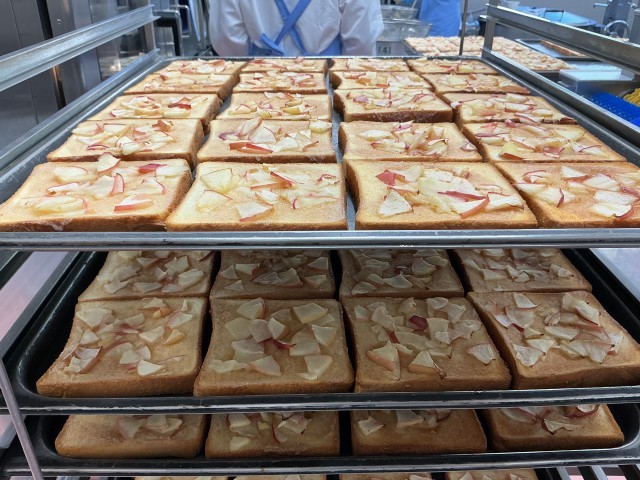 今日のアップルシナモントーストは、食パンにシナモンバターを塗り、その上にりんごをのせて焼きました。