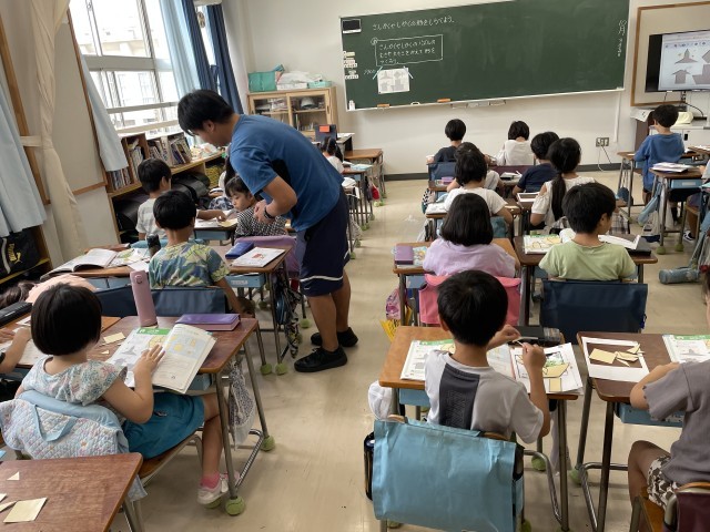 形や大きさの違う三角形や四角形の位置を変えたり、向きを変えたりして形づくりに取り組みました。