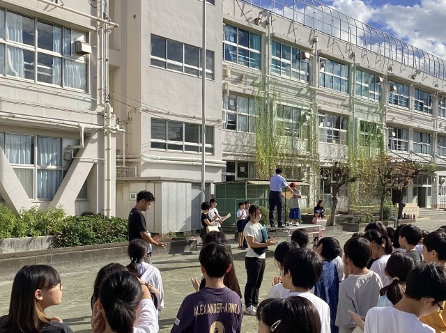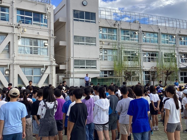 教育実習生の紹介や交通安全ポスターの表彰が行われました。