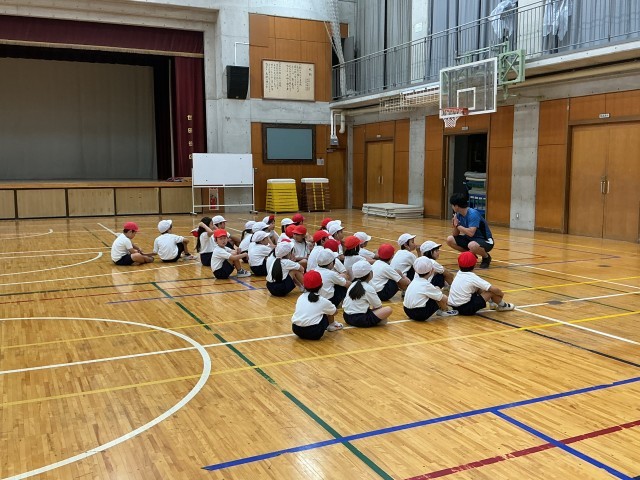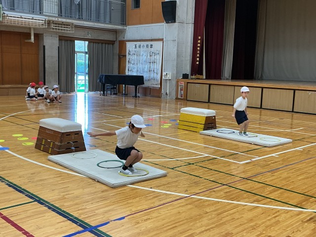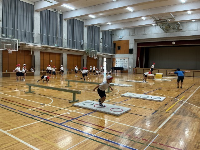 とびばこ遊びが始まりました。今回は,「ピタッと名人になろう」ということで,着地がピタッとなることを意識して,様々な器具を使って運動遊びをしました。