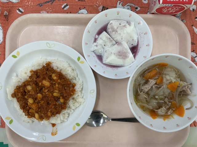 「ものすごくおおきなプリンのうえで」という絵本をイメージして、いつもは1人分ずつカップで作るところをバットいっぱいにパンナコッタ液を流し込み作ってみました。写真のものは、切り分けた1人分の量になります。