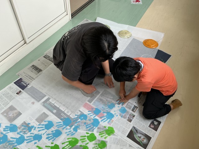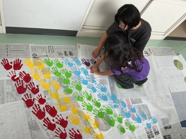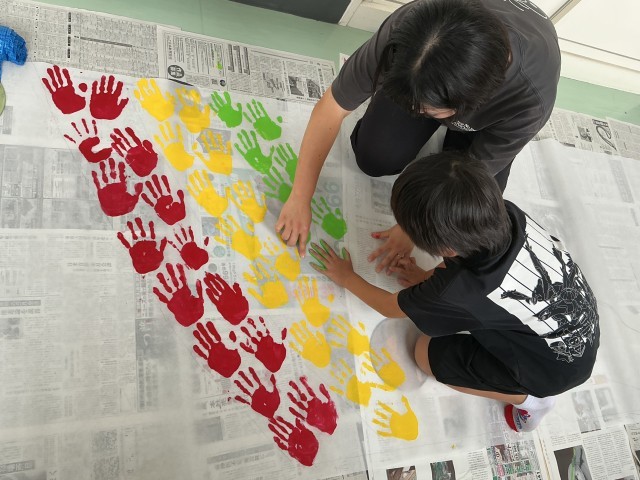 来月の展覧会に向けて,共同制作の作品を作成しました。一人一人の手形を使って大きな虹を作りました。手に絵の具を塗り,手形をスタンプしました。赤,黄色,黄緑,水色,紫の5色で,綺麗な虹が出来上がりました。