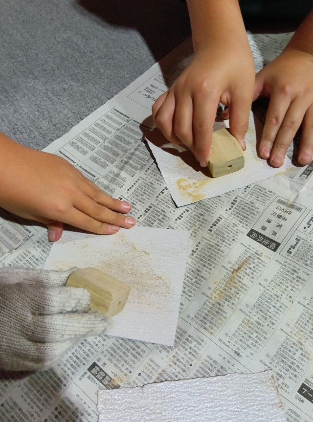 木をヤスリで一生懸命に削りました。