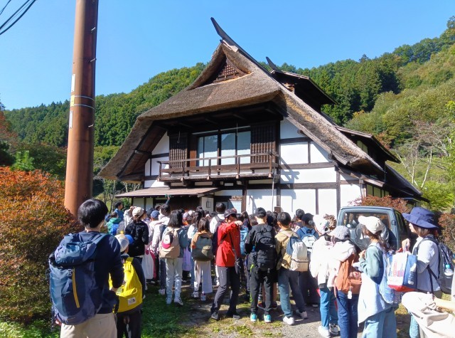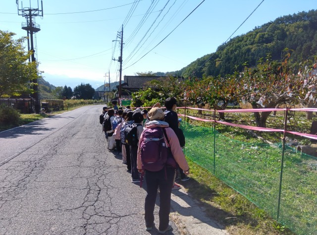 ミニ村めぐりを行い、ふじやまビレッジの周りを歩きました。東京では、あまり見られない稲刈りが終わった田んぼや民家、ブルーベリー農園を見ることができました。