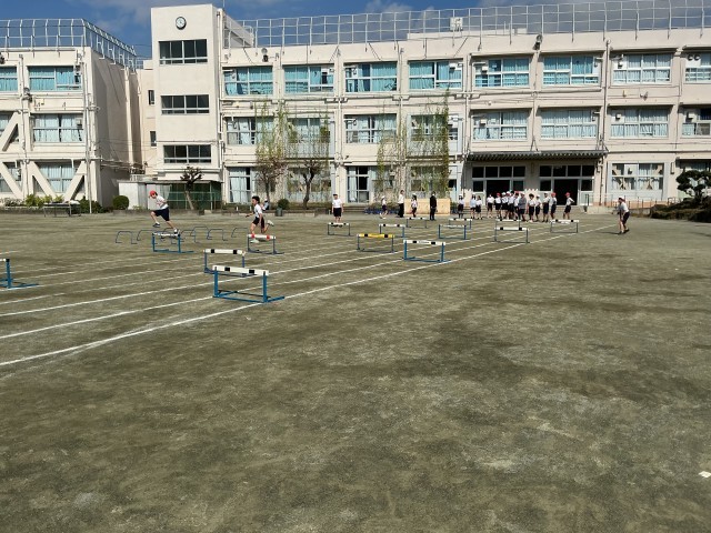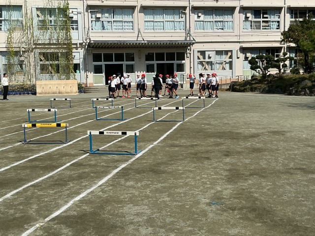 リズミカルにハードルをまたぎ越せるように、練習しました。