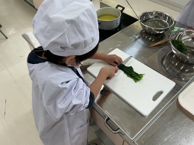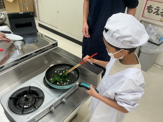 飲食店を経営されている保護者の方に、畑で育てているほうれん草を使ったレシピを考えていただきました。今回作ったのは、ほうれん草のにんにく炒め。フライパンで「炒める」という料理法を学習しました。「フライパンを使って料理をするのは初めて」という児童もいましたが、安全に気をつけながら協力して調理を進めることができました。