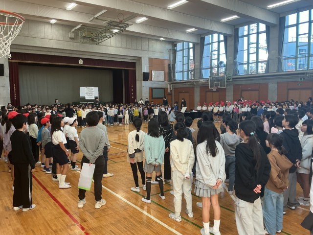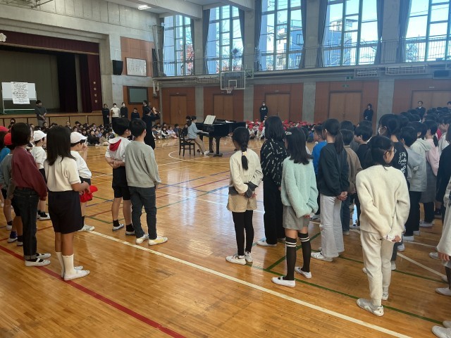 まず、低学年、高学年がそれぞれの歌声を聴き合いました。最後には全員で歌いました。