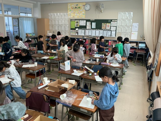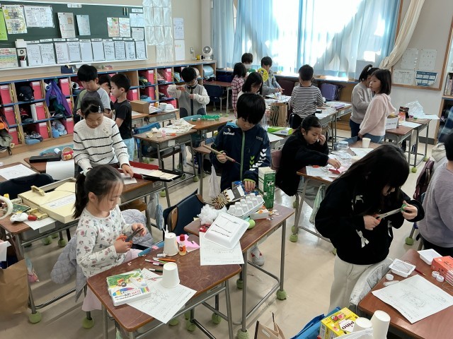 生活「あそんで作ってくふうして」では、動くおもちゃ作りに挑戦しています。風の力やゴムの力などを使って、動くおもちゃを製作中です。