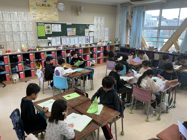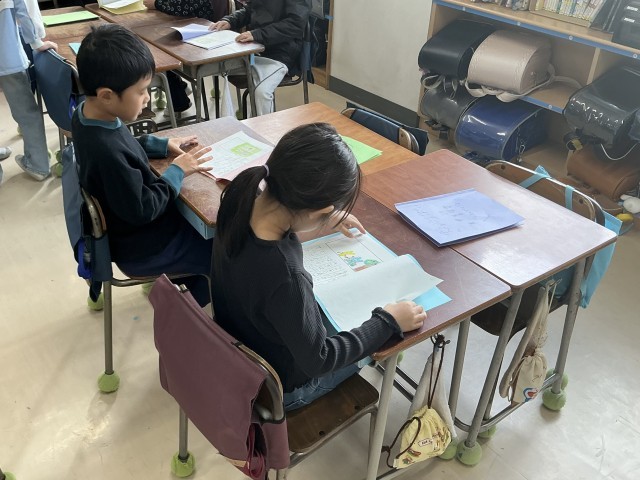 国語「お話のさくしゃになろう」では、2ひきのネズミが登場する物語文を書きました。完成したお話を製本し、お友達と読み合いを行いました。