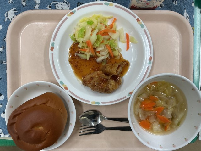 2学期最後の給食です。揚げたチキンに甘酸っぱいマーマレードソースをかけました。