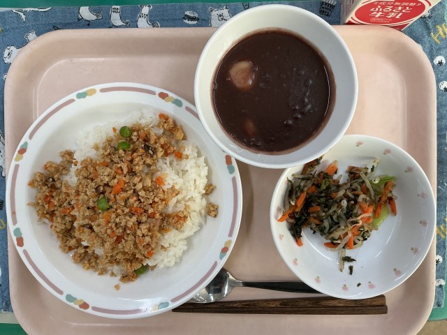 あずきがゆを食べることが多いそうで、給食では、小豆を使ったお汁粉を作りました。