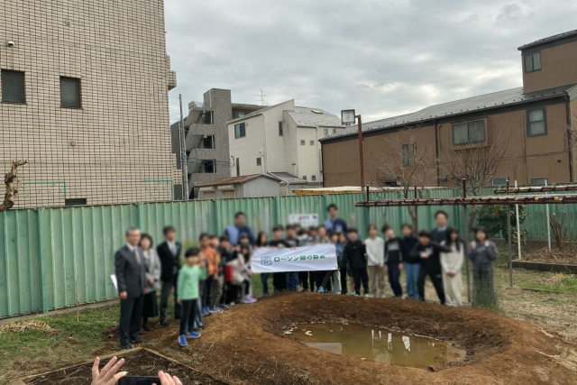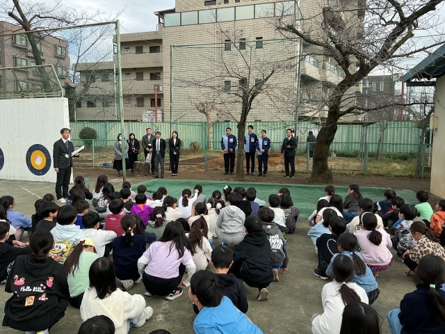 学校ビオトープの完成を記念して、体育館で式典を行いました。東京緑化推進委員会のご協力のもと進めている学校ビオトープの整備。池の修繕や植樹を行い、今日に至りました。式典では、協賛していただいている方のお話や、児童によるこれまでの活動報告、記念撮影などをしました。これからも生き物のすみかとして、大切に保全していきたいと思います。
