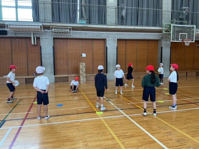ボール投げ遊びの学習をしています。今回は、ボールを投げてダンボールを倒すゲームを行いました。攻め側はボールを投げること、守り側はボールが当たらないように守ることを意識して行いました。