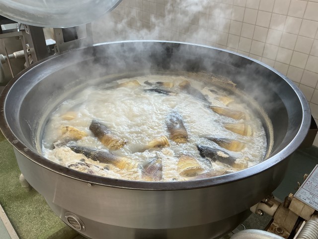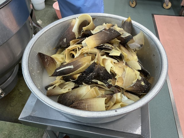 朝納品された24キロの生たけのこを給食室であくぬきをし、皮を剥いて切り、たけのこごはんを作りました。