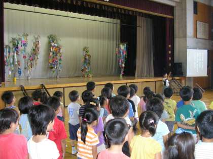 1,2年生の願い事が書かれた短冊を飾った笹を前に、集会委員会が企画した「七夕○×クイズ」で楽しんだり、「七夕の歌」を願いを込めて歌ったりしました。