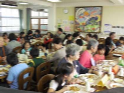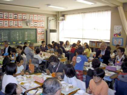 3年生が祖父母の皆様をお招きして「ふれあい給食会」が開かれました。この日まで一生懸命準備をしてきた子どもたち、控室へお迎えに行く時は「どきどきするー!」と言いながらも、うれしくてたまらない様子でした。教室とランチルームに分かれ楽しくお話をしながら会食をした後は歌と手作りのお花をプレゼントしました。ちなみに献立は「きのこご飯・牛乳・豚肉と大根のうま煮・りんご」でした。久しぶりに食べた給食はいかがでしたか。お越しいただいた祖父母の皆様、本当にありがとうございました。