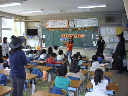 英語ボランティアの保護者の皆様にご協力いただき、朝の「学びタイム」に取り組んでいる「英語タイム」。今日は1,2年生を対象に、ハロウィンにちなんだゲームなどを行いました。お母様方はハロウィンの衣装を身につけて登場、子どもたちは大喜びでした。いつもご協力いただいている英語ボランティアの皆様、ありがとうございます。