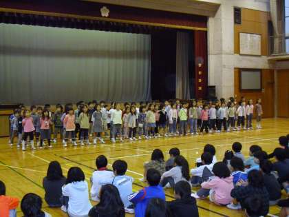 今日の全校朝会では、1年生が教科「日本語」の日頃の学習の成果を発表しました。1年生が全員で暗唱したのは宮沢賢治の「雨にも負けず」です。長い詩を覚え元気よく暗唱する姿は大変微笑ましかったです。また、聞きながら一緒につぶやく他学年の子どもたちの姿もちらほら。学習の積み重ねの成果が感じられました。1年生、よく頑張りました。
