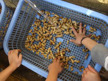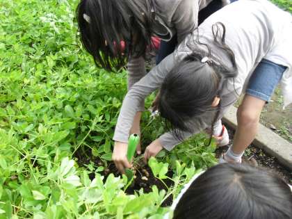 2年生が春に植え,育ててきた落花生を収穫しました。土の中から出てきたたくさんの落花生を見て、みんなは大喜び。きれいに洗って乾燥させ、乾ききったら殻から取り出し、炒って食べます。今からその日が楽しみですね。