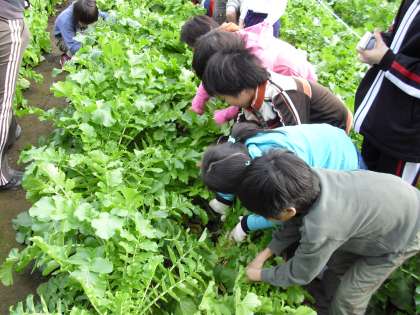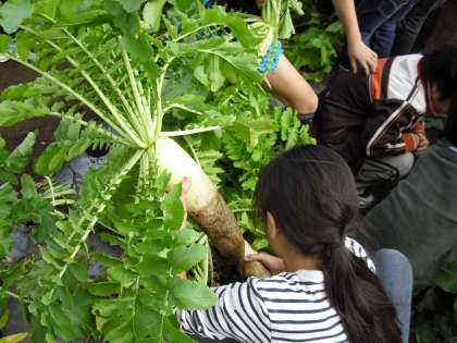 子どもたちのためにご協力いただいている地域の方のご指導のもと、3年生が大根を収穫しました。小さな種から見事に大きく成長した大根が土の中から顔を出すと、子どもたちは歓声を上げ喜んでいました。土に触れ、収穫の喜びに触れ、売り物とは違った土にまみれた大根を手にした子どもたち。大変貴重な体験となりました。このような経験ができるのも、地域の方のご協力があってこそです。本当にありがとうございます。また、お手伝いいただいた保護者の皆様ありがとうございました。
