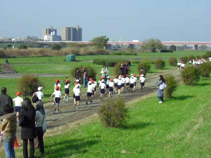 毎年恒例の多摩川河川敷で行う「マラソン大会」、11月とは思えぬ小春日和の下、行われました。1,2年生はクラスで一緒に楽しく走り、3〜6年は男女分かれてタイムを計測します。広い河原で自分の力を精いっぱい出し切って走る子どもたちの姿は、この日の気候と同様に大変すがすがしいものでした。みなさん、よく頑張りました。また、応援に駆けつけてくださった地域・保護者の皆様、ありがとうございました。