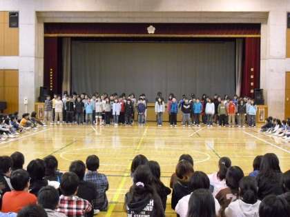 この日の日本語発表は5年生。題材は「香炉峰下、新たに山居を卜し、草堂初めて成り、偶たま東壁に題す」です。難解な漢詩であるにもかかわらず、中国語と日本語で堂々と暗唱しました。5年生が全員で心をあわせ、素晴らしい力を発揮しました。