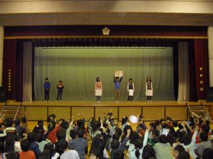 今日の集会活動は集会委員会が企画した「先生クイズ」です。先生に関するクイズの答えを4つの中から選びます。「○○先生の子どものころ好きだった食べ物は?」「△△先生の好きな色は?」など、難問が続出。普段は見えない先生方の違った一面をうかがい知ることができたようで、子どもたちは楽しんでクイズに取り組んでいました。