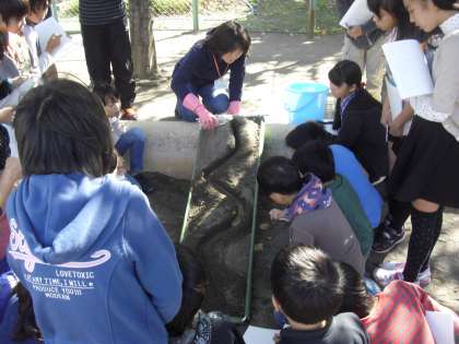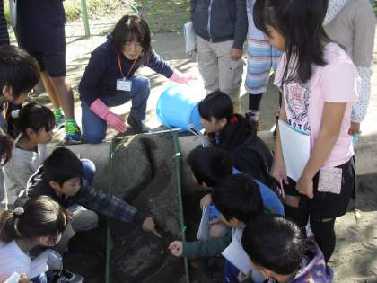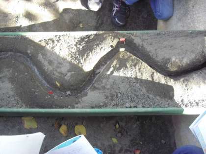 理科で「川の流れの働き」を砂場を使って実験をしました。流れによって削れる所、土砂がたまる所、それを川場の地域に見立て考えました。