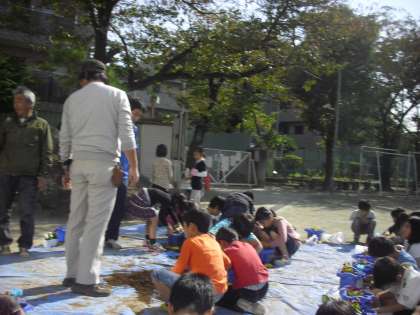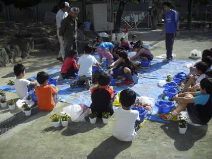 2年生は、園芸家の方に花(ビオラなど)の寄せ植えを教わり、アサガオの鉢に2ぞの苗を植えました。土の入れ方と量、苗をポットから取る取り方など、教えていただき、植えることができました。
