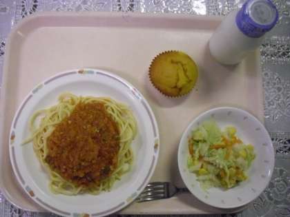 今日のメニューは、スパゲティーミートソース、コーンサラダ、カボチャマフィン、牛乳でした。