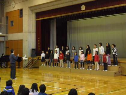 今日の音楽朝会では、19日に開催される「世田谷区合唱交歓会」に参加する合唱団が主役。本番に先立って、全校児童の前で美しい歌声を披露しました。曲目は「だれかが口笛ふいた」「COSMOS」の2曲です。美しいハーモニーが体育館中に響き渡り、子どもたちはうっとりと聞き入っていました。19日の本番でもこれまでの練習の成果がきっと発揮されるでしょう。合唱団のみなさん、頑張ってください!!