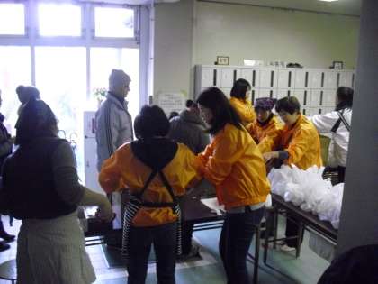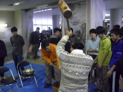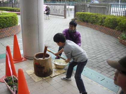 お餅の販売前から、雨が降り始めましたが、大勢の子どもたちがお餅を求めに保護者と来校し、大賑わいです。子どももお餅をつきました。尾山台中学校の生徒や都市大学の学生がボランティアとして、協力をしてくれました。