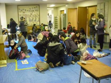 雨が降っているの搗きたてのお餅は、体育館の入口に特設した所でいただきました。