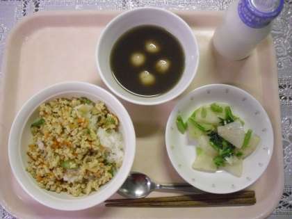 今日のメニューは、高野豆腐のそぼろ丼、かぶのひとしお、白玉しる粉、牛乳でした。
