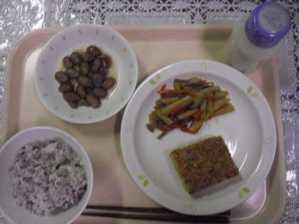 今日のメニューは、ゆかりご飯、松風焼き、レンコンのきんぴら、煮豆、牛乳でした。