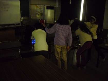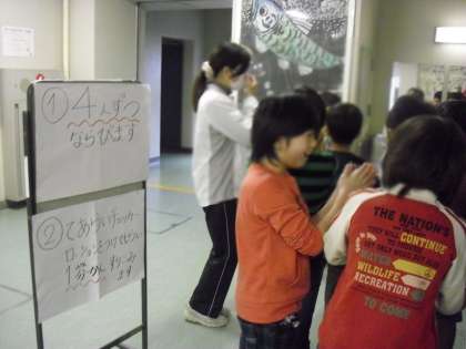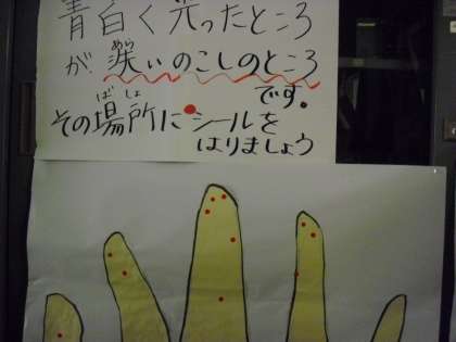 洗い残しを大きな手が描かれた模造紙に記して、集計します。