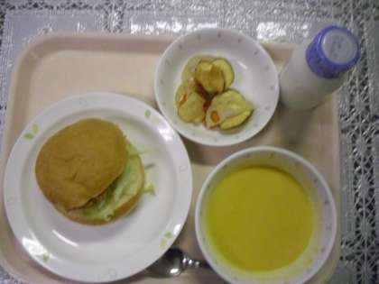 今日のメニューは、タンドリーチキンサンド、カボチャポタージュ、野菜チップ、牛乳でした。
