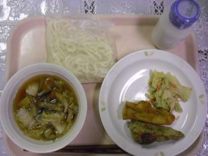 今日のメニューは、けんちんうどん(ソフト麺)竹輪の二色揚げ(カレー、青海苔)野菜のゴマだれかけ、牛乳でした。今週は、学校給食週間です。