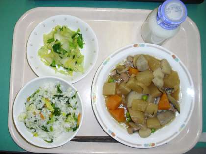 今日から3学期の給食が始まりました。今日の給食は、1月7日の「七草」にちなんだ行事食です。献立は「七草ごはん・鶏肉と大根の炒め煮・野菜のゆずあえ・牛乳」です。昔から守ってきた日本人の知恵が込められた行事にちなみ、七草ごはんを食べ、3学期も元気に学校生活を送ってほしいと思います。